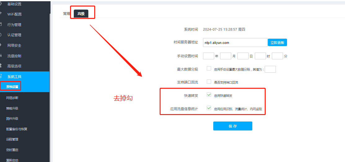 3、关闭快速转发:找到“快速转发”选项,请将勾去掉。这可以防止路由器在处理特定类型的网络流量(如vpn流量)时使用硬件加速,从而避免潜在的冲突。