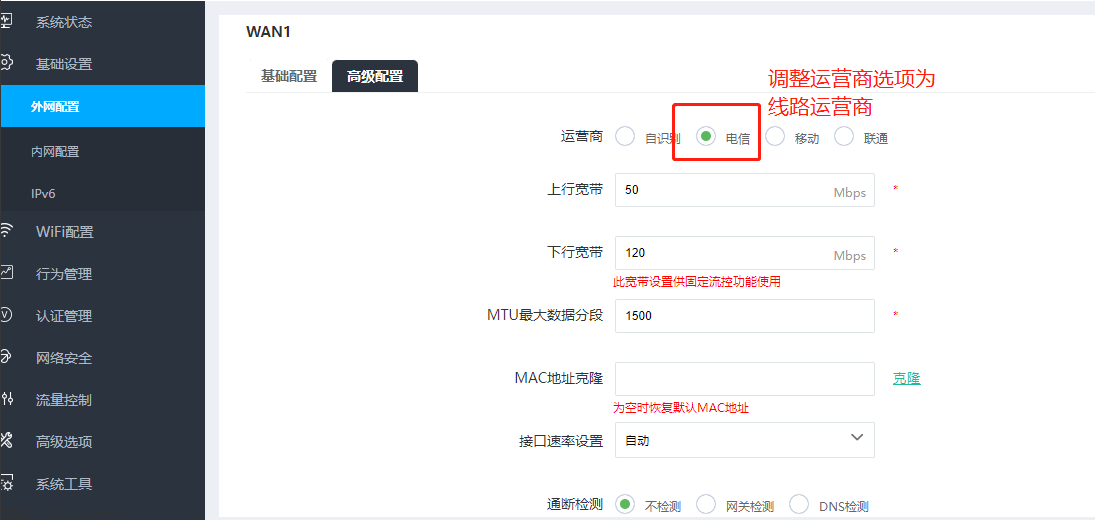 ①、将默认线路策略设置为“单线”,并选择互联网接口(wan1)作为默认路由。