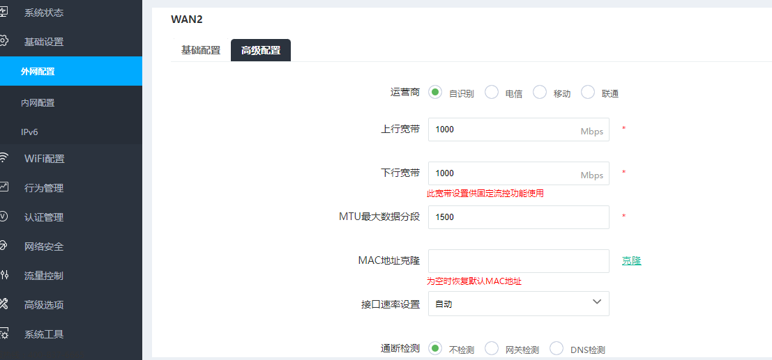 4、配置wan2口(医保专网):同样在“外网配置”中,编辑wan2口配置。