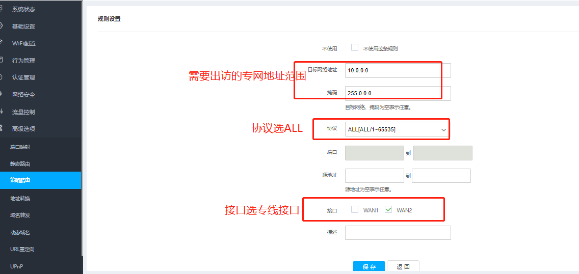 以策略路由为例,如果是拨号线路,则选择策略路由无需填写网关。如果是静态或者是动态ip上网,则2种均可。