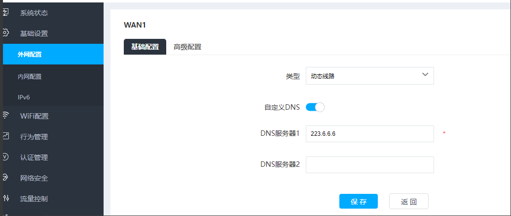 ①、编辑wan1口配置,选择正确的上网方式,并根据需要配置自定义dns(可选),如开启,则表示外线的dns以自定义的为准。