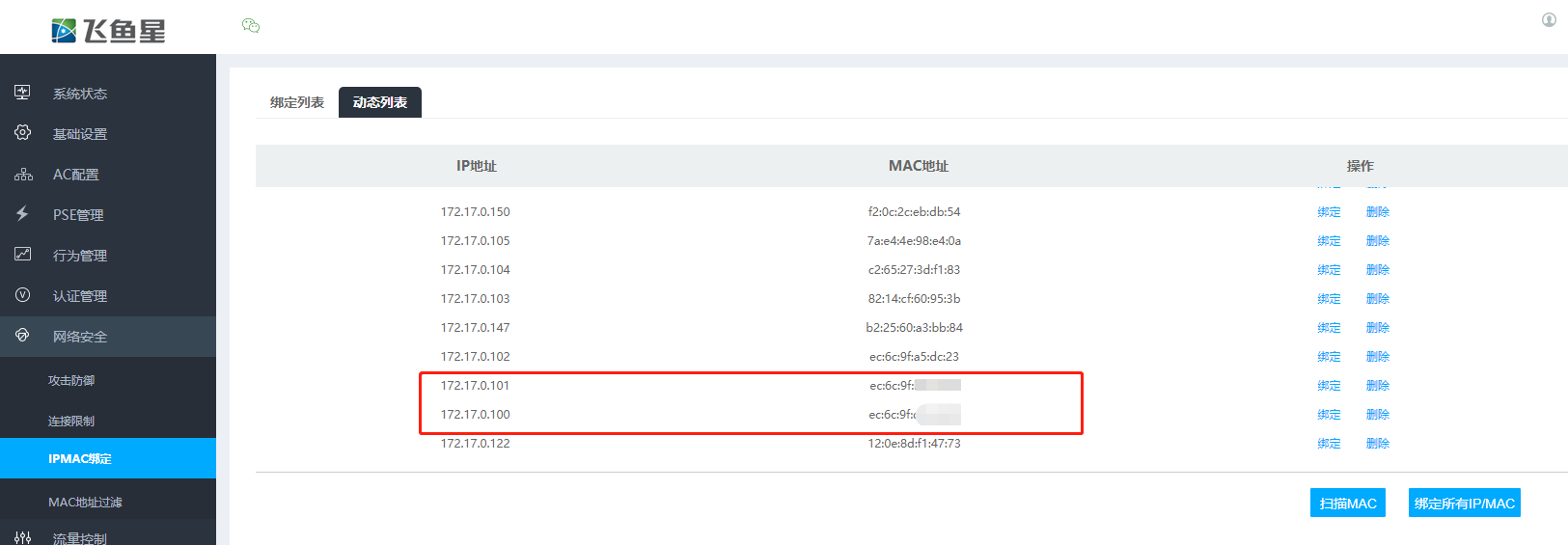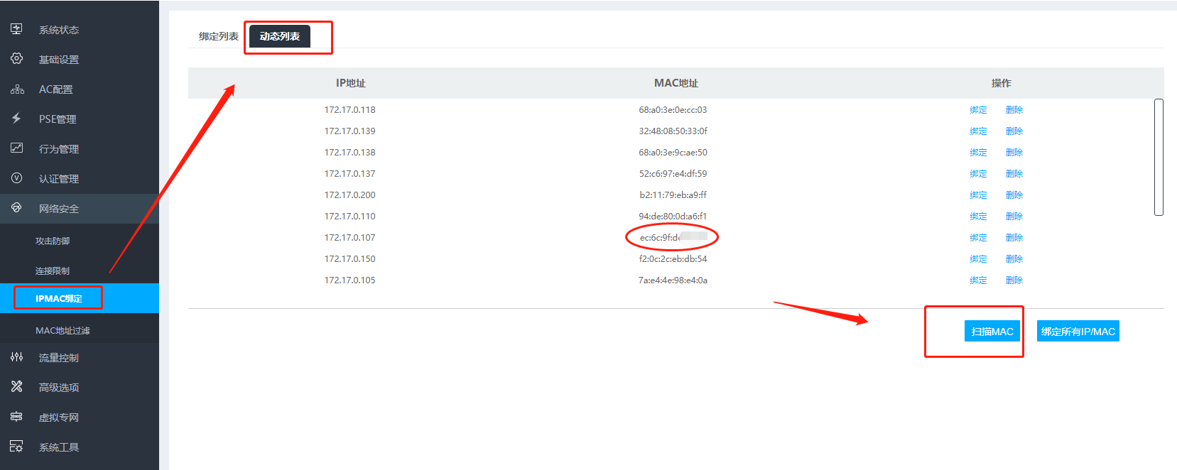 扫描内网设备:利用ac的网络安全功能中的ip/mac扫描工具,查看接入内网的设备情况,包括ap的mac地址和ip地址。