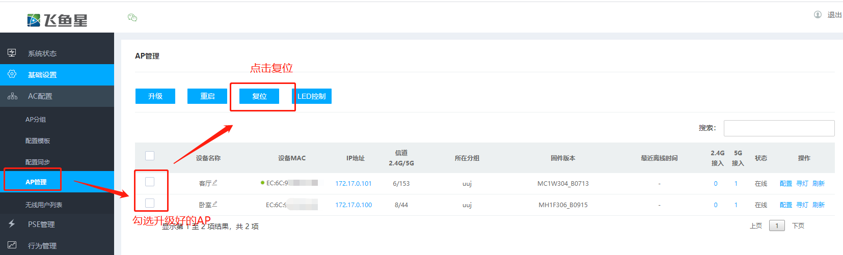 复位操作:升级完成后,可在ac中对ap进行复位(也可在ap界面中复位)操作,以确保固件更新生效。