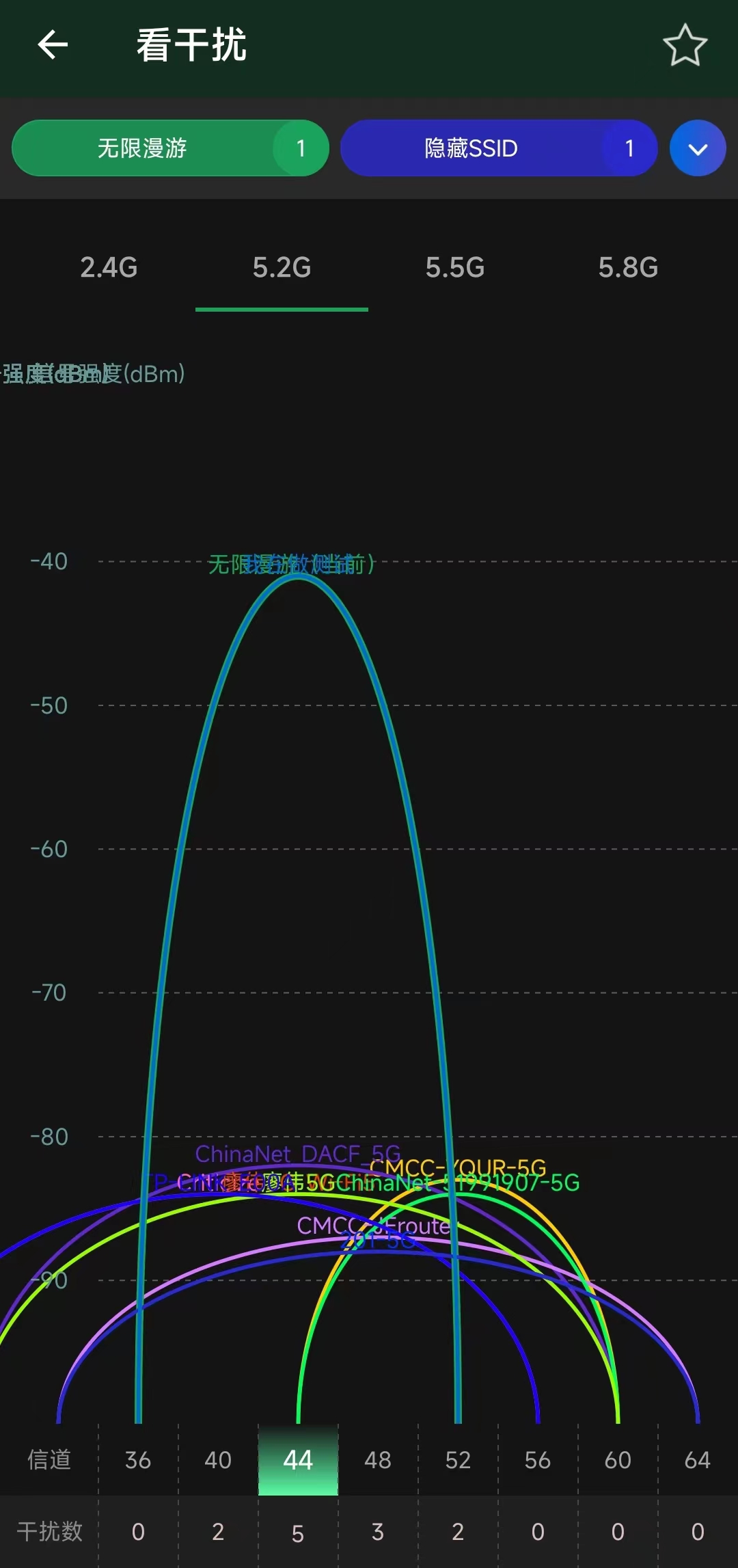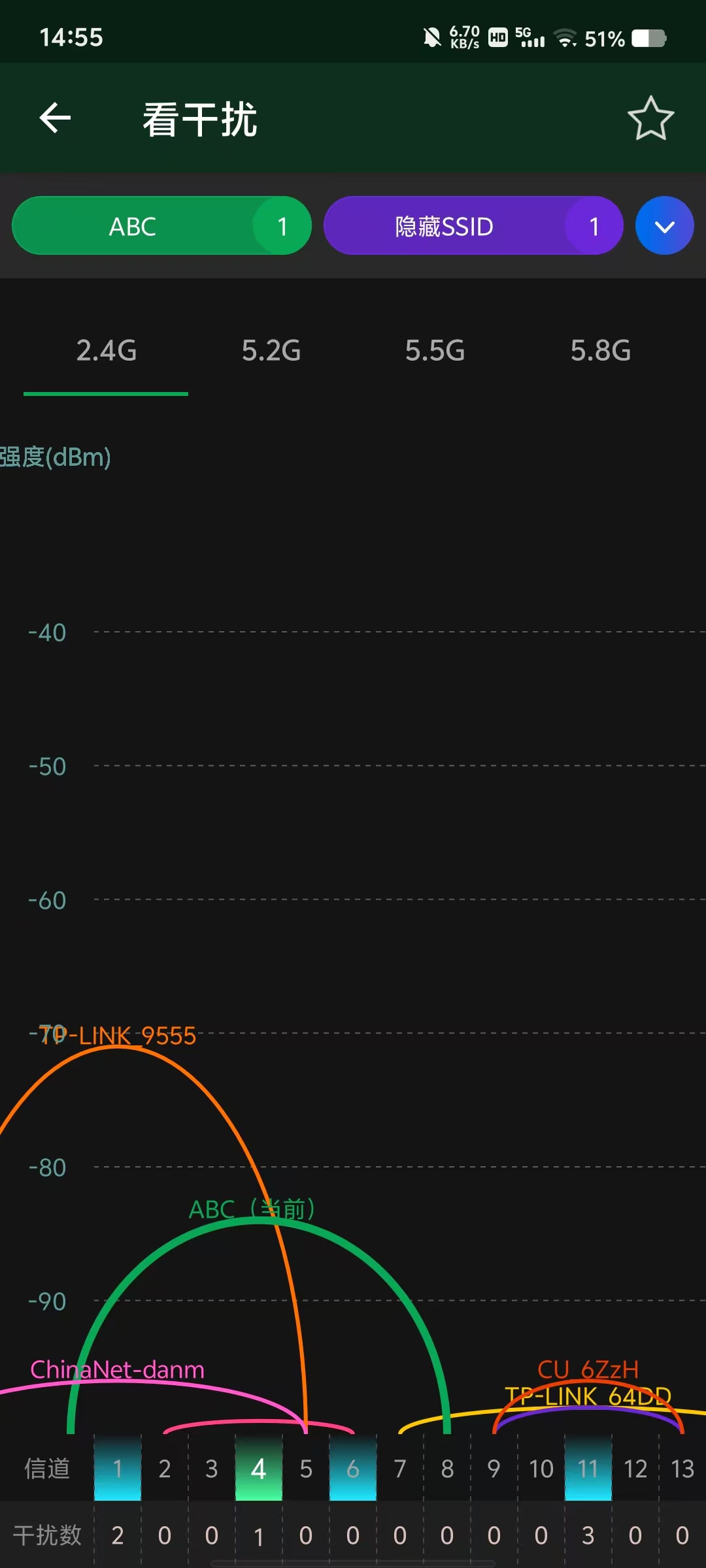 ②、如果看干扰位置能看出当前链接的2.4g的ssid信号已经弱到-80以下了,这种几乎是无法正常使用的,必须更换位置,或者看是否可以中继5g信号,如果没有5g,就只有挪动位置。