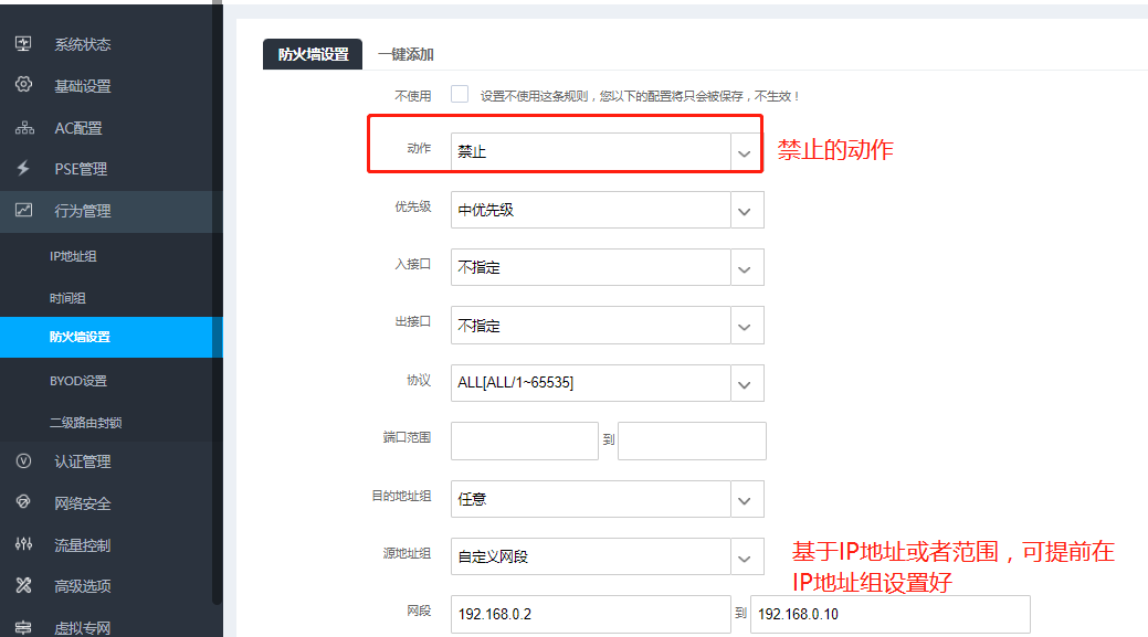 注意此功能必须是针对固定终端做完地址分配全部一一对应的时候才可以操作,否则会引起无法正常上网或无法登录设备。(附:如何做ip/mac绑定)