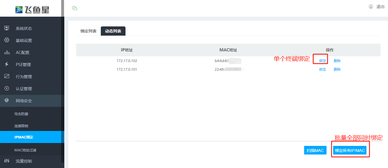 扫描内网设备:在“网络安全”菜单下找到“ip/mac地址绑定”选项,点击动态列表中的“扫描”按钮,获取当前内网中设备的ip和mac地址列表。