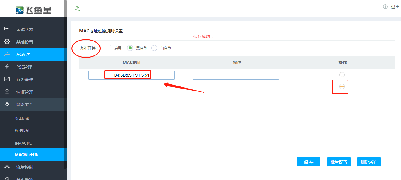 - 如果选为白名单,则仅允许规则列表中的mac的终端可以上互联网,其他的终端全部拦截。