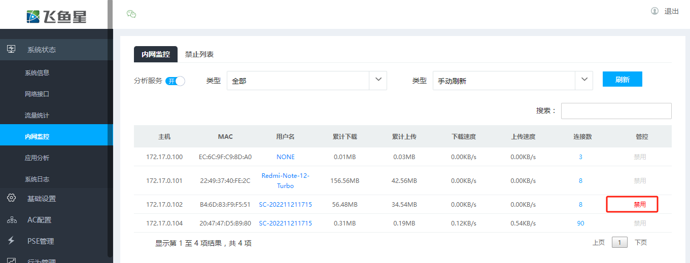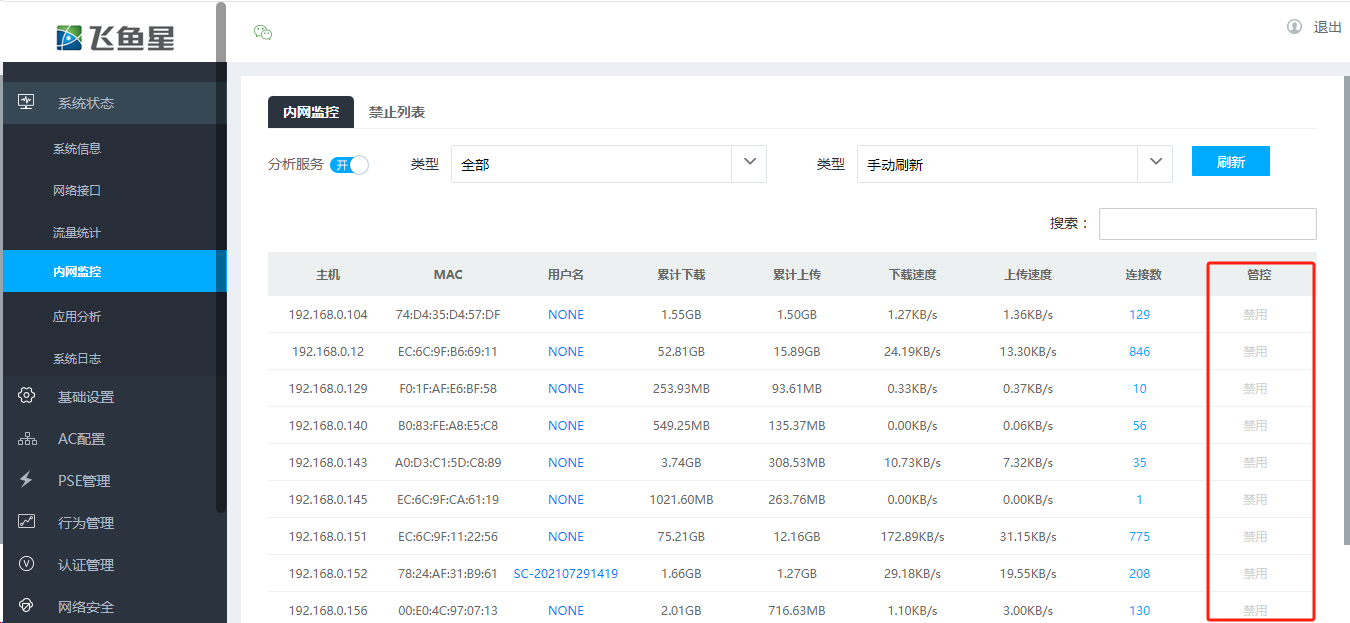 此时是基于终端ip的形式的控制,要解除可以在内网监控---禁止列表中删除,只能同时删除全部。