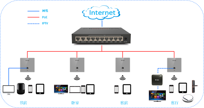 iptv融合传输:方案支持单线iptv复用,让一根网线同时传输wi-fi与iptv数据,做到无线上网和看电视两不误,还能为开发商节约布线成本。