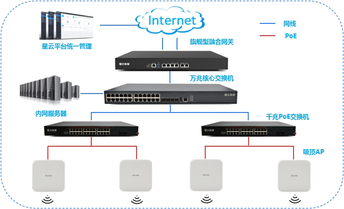 网关内置ac功能,且无线ap即插即用,无需配置,通过融合网关就能对部署在不同位置的无线ap实现本地集中管理。