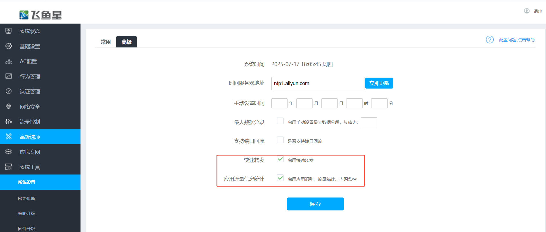 - 开启软件转发:系统工具---系统设置---高级中启用“应用流量信息统计”
