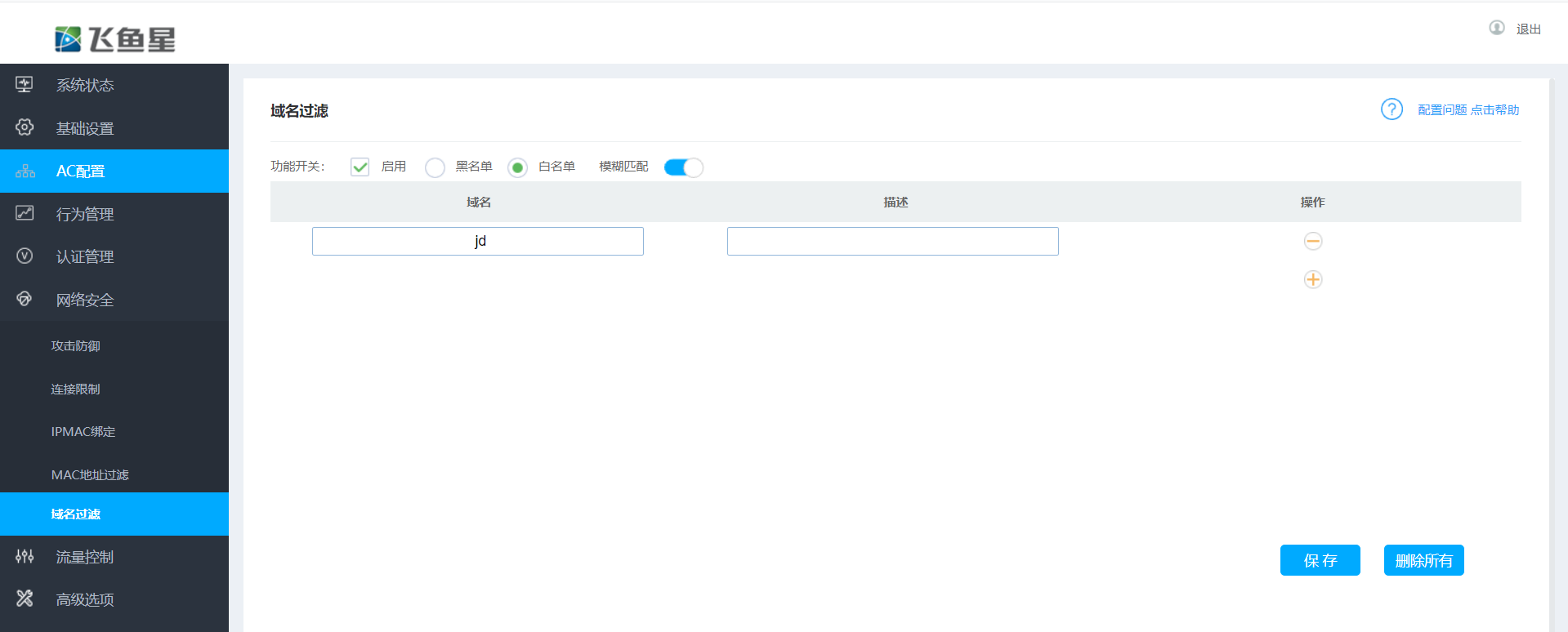 - 选择“白名单”。域名中填写飞鱼星凯发pa旗舰厅官网的关键词“adslr”保存。同时建议保持默认开启“模糊匹配”。